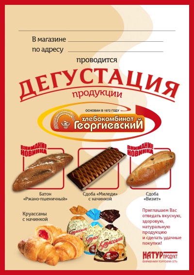 Дорогие покупатели рады сообщить вам, что ОАО «Хлебокомбинат «Георгиевский» проводит дегустацию продукции в собственных фирменных сетях «Георгиевск-Хлеб»,а также в сетях «Опт-Торг»,график проведения ниже, будем рады вас видеть!!!!