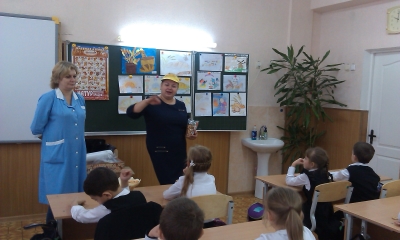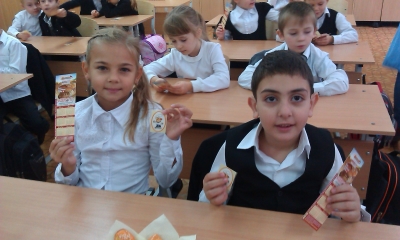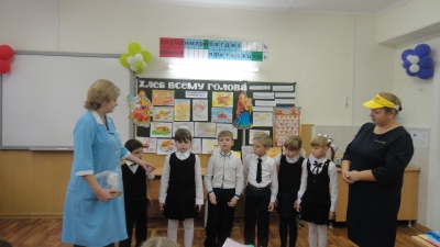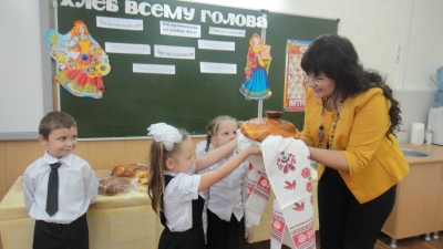Первоклассники с большим удовольствием участвовали в конкурсе загадок и пословиц, за верные ответы получали в награду не пятерки, а ароматные сушки и печенье. Благодаря классным руководителям были подготовлены рисунки на тему: «Хлеб – всему голова», стихи, пословицы и поговорки о хлебе. Аванесян Р, ученик 1 - А класса (классный руководитель Козинкина Г.И.) удивил всех своей поделкой из слоеного теста. Ученица 1 - Б класса Винокурова В. (классный руководитель Иваненко Т.В.) в образе русской хозяюшки с хлебом, солью и русской песней поблагодарила гостей за интересный урок.