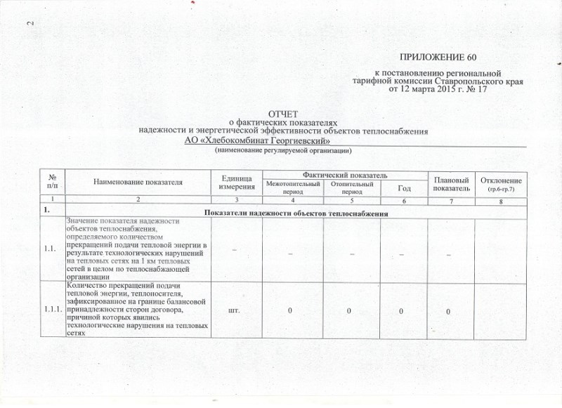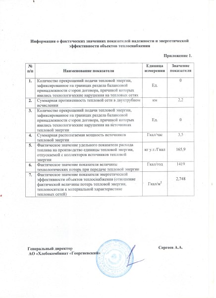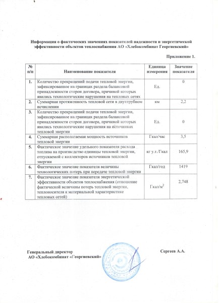 Информация о фактических значениях показателей надежности и энергетической эффективности объектов теплоснабженияо фактических значений показателей надёжности и энергетической эффективности объектов теплоснабженияВ соответствии с пунктом 41 Правил определения плановых и расчёта фактических значений показателей надёжности и энергетической эффективности объектов теплоснабжения, а также определения достижения организацией, осуществляющей регулируемые виды деятельности в сфере теплоснабжения, указанных плановых значений, утверждённых постановлением Правительства Российской Федерации от 16 мая 2014 г., информируем о фактических значениях показателей надёжности и энергетической эффективности объектов теплоснабжения АО «Хлебокомбинат Георгиевский» |